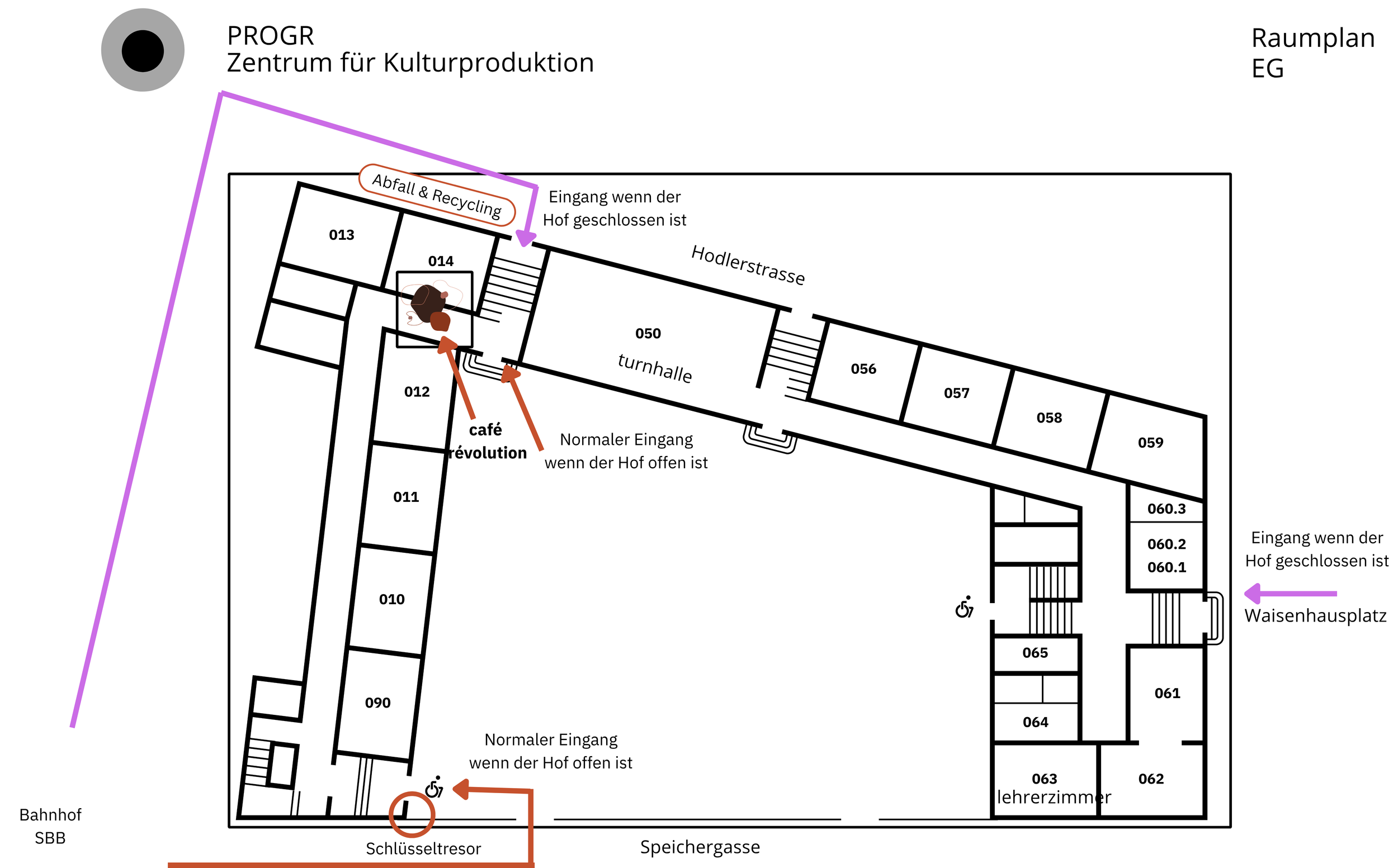 Müll und Recycling entsorgen: Sollte an deinem Anlass viel Abfall entstehen, entsorge es bitte in den entsprechenden Containern vom PROGR. Die Container stehen an der Hodlerstrasse gleich neben dem Eingang. (siehe Lageplan)